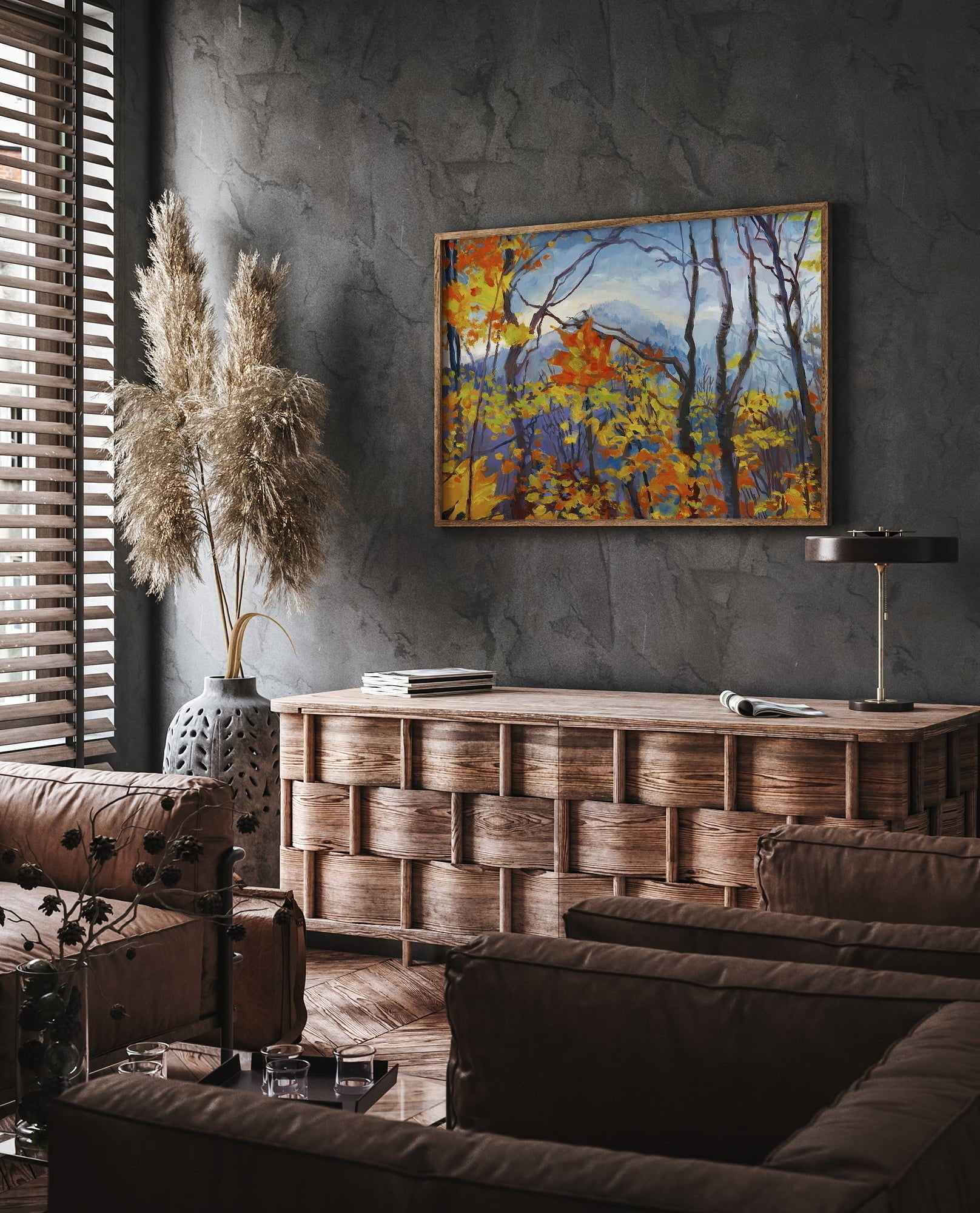 Travel art of a Quebec National Park in moody autumn weather. Canadian landscape extra large wall art.